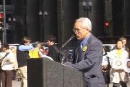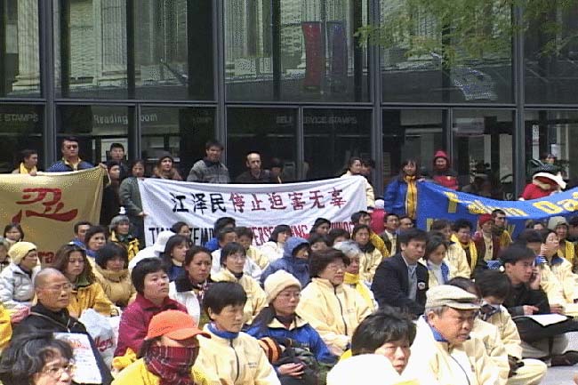 上午十点,从世界各地赶来的近千名学员汇集在芝加哥联邦中心广场,他们自觉地排列整齐,伴随着舒缓的音乐炼功。路边行人纷纷驻足,维持秩序的警察,也悠闲地站在一旁,不时向散发传单的法轮功学员微笑致意。尽管气氛平和友好,但从学员手持的横幅,可以看出他们的坚定的意愿,那就是早日结束这场对信奉真善忍的法轮功学员的迫害。