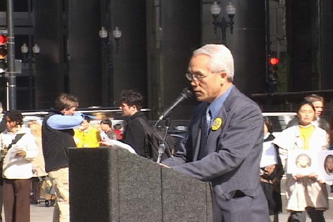 新闻发布会结束之后,法轮功学员手举横幅,从广场一直游行到中国驻芝加哥总领事馆门口,整齐庄严的游行队伍长达数个街区,吸引众多行人注意。许多路人纷纷向法轮功学员表示同情和道义支持。游行队伍到达中领馆后,法轮功学员就在领馆对面整齐地静坐请愿。