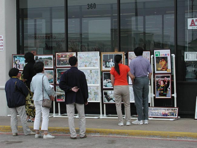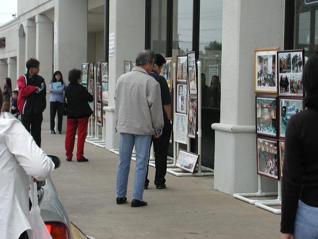 周六、周日的两天阴沉沉欲下雨的样子,但学员们坚持按计划举行活动,因为大家都清楚地意识到对中国人民讲清真相有多么的重要和紧迫。真相图片摆放在购物中心橱窗的外面,人们从很远就可以看到。这次主要展出的照片包括99年以前大法在中国的情况,多幅中国主要城市学员炼功的巨幅照片,大法在海外的洪传盛况,和江氏政府对法轮功的镇压。学员们准备了各种真相材料,包括英文、越南文等。许多中国人都高兴的接过了学员们的真相资料。