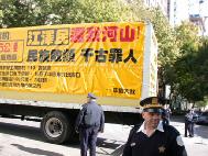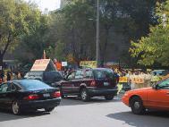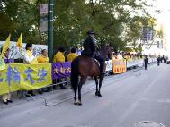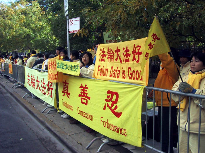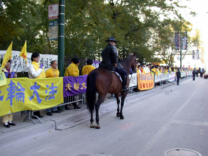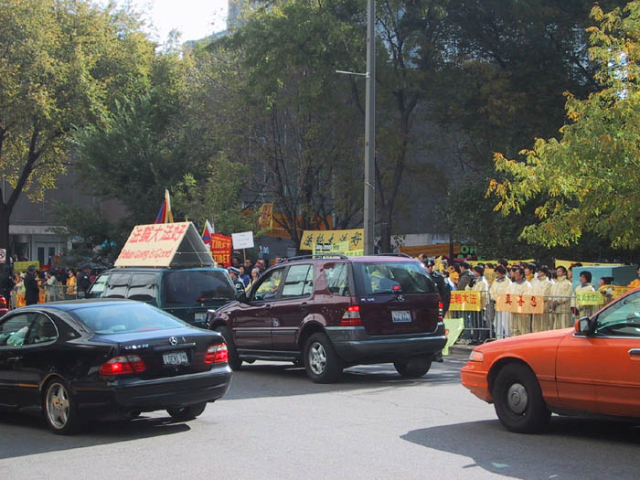 来自芝加哥的报导:10月22日上午11:25分,江XX到达芝加哥理兹(Ritz Carlton)酒店。为避免正门上千的和平抗议法轮大法学员和其它团体,江XX的坐车从酒店的停车场出入门驶入酒店。尽管中国领事馆安排了芝加哥地区各大学四五百人的欢迎队伍,也抵挡不过铺天盖地的“法轮大法好”,“停止镇压法轮功”的标语横幅,以及满眼的黄上衣。