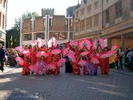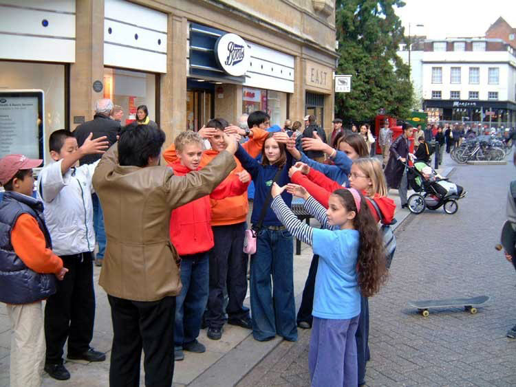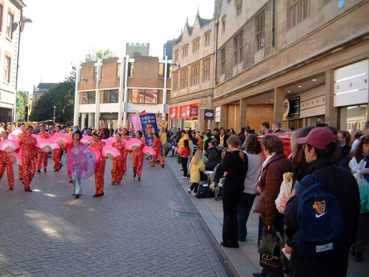 17日和18日两天,学员们在剑桥行人游客最集中的国王学院及“Boots”超市前演示功法和征集签名。设计精致的“法轮大法在英国”系列展板及精选的“正法之路”图片展吸引了很多路人驻足观看。大法弟子19日的游行和演出更是为一向有点矜持含蓄的剑桥增添了勃勃生机。人们惊诧地围着这支仿佛是从天而降的队伍,很多人都是伸着手来要传单并迫不及待的阅读起来,几小时之内就有近万份中英文资料被观众取走。许多以前碰过多次都绕着走的中国人也被眼前的场面所感染,他们和周围的英国观众一样静静地观看着,仔细的阅读着大法真相材料。很多中国人还纷纷拍照留念,有的还向大法弟子深入了解更多的真相。