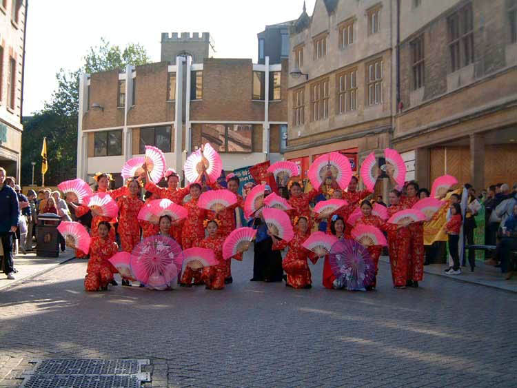 在我们的游行演出期间多次碰到一对年老的英国夫妇,丈夫告诉我们他的夫人在我们先前发正念的时候就禁不住流眼泪,当看到我们在国王学院门前唱大法弟子创造的歌曲时有被感动得眼泪直流。有一次,当女学员们在法轮大法好的音乐声中跳扇子舞时,突然音响出故障中断了,学员们马上自发地齐声接着清唱起来继续跳舞。在第一排跳舞的学员发现有的英国观众在那一刻眼泪夺眶而出。