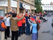 19日下午,在国王学院门前演唱学员创造的歌曲时的场景甚为感人。接近傍晚时分,天气变得非常清冷起来,女弟子和小学员们的演出服也显得很单薄。可她们依旧一个接一个不停地演唱“法轮大法好”、“可贵的中国人”等歌曲,有的唱着唱着就不禁泪流满面,有的嗓子也唱哑了,可那沙哑的声音依然那样具有通天彻地的穿透力,有的路过的中国人也不知不觉中学会并情不自禁地哼起了大法弟子的曲调。