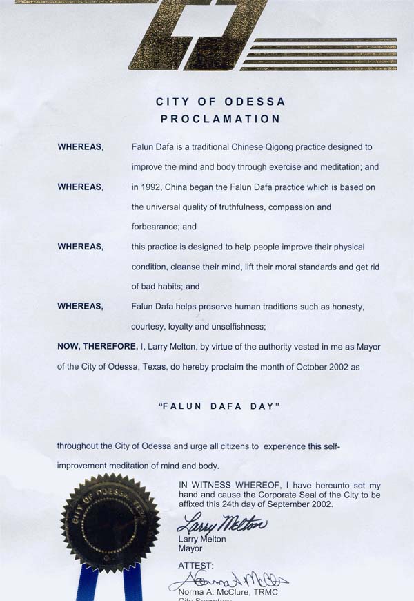 鉴此,我,莱瑞.麦尔顿(Larry Melton),以德州奥德萨市市长的名义,特此宣布2002年10月为奥德萨市