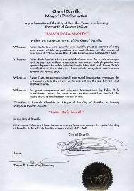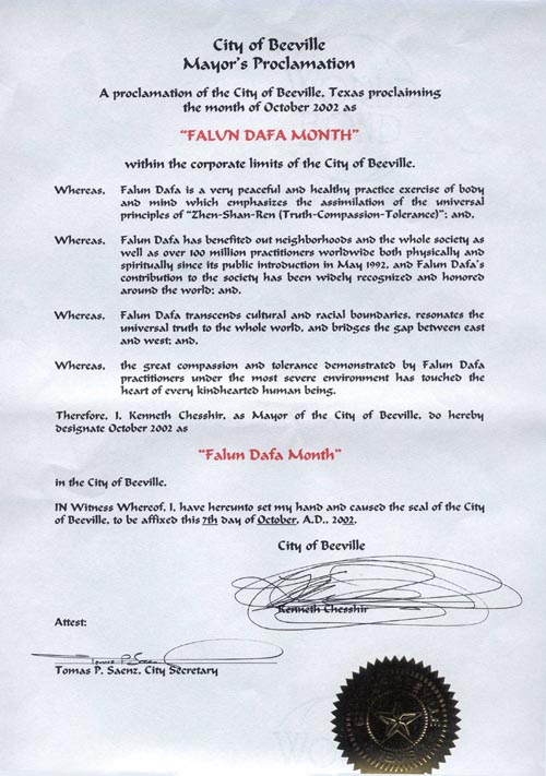 鉴此,我,德克萨斯州毕维尔市(Beeville)市长肯尼斯-彻舍( Kenneth Chesshir),宣布2002年10月为毕维尔市 “法轮大法月”