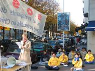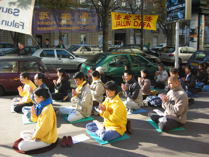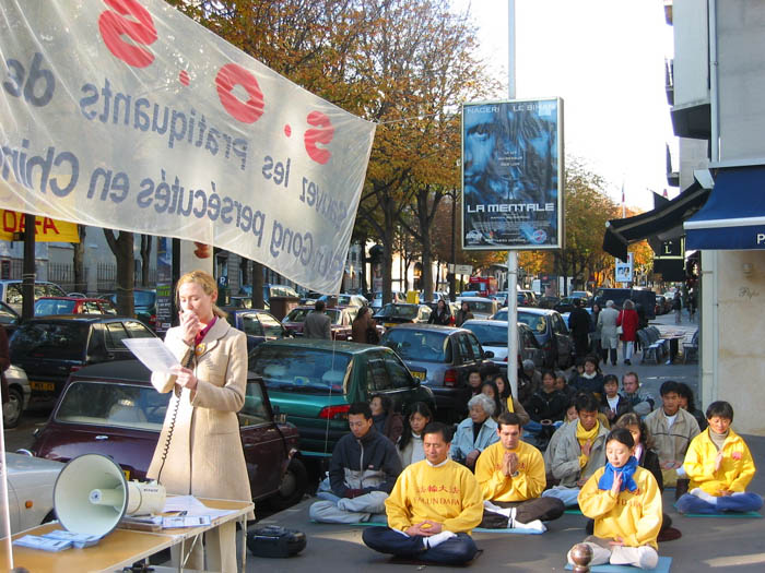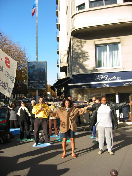 为让更多的世人了解江XX政治流氓集团对法轮功的迫害,为使这场荒谬的迫害早日得以制止,23日下午,法国法轮功学员来到中国驻法国大使馆前进行和平请愿活动。活动期间,学员用中法文宣读了六国法轮功学员(包括一名法国学员)联名起诉江XX的声明;学员们还频发正念,用功能铲除在另外空间操控恶人干坏事的邪恶因素。