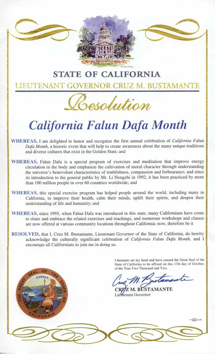 所以,现在,我,科鲁斯·布斯特曼堤,加利福尼亚州副州长,在此希望所有的加利福尼亚州居民和我一起,认同这个文化意义深远的“加利福尼亚州法轮大法月”庆祝活动。