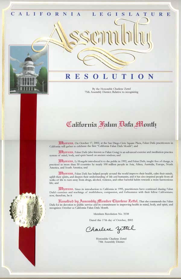 加州众议员颁发决议褒奖“加州法轮大法月”