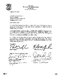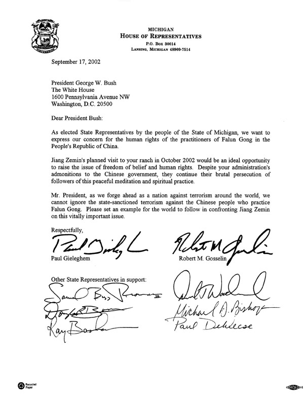 作为密歇根州的民选议员,我们写信向您表达对中国法轮功学员人权状况的关切。