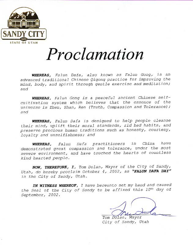 鉴此,现在,我,汤姆·道兰,犹他州桑迪市市长宣布2002年10月4日为本市“法轮大法日”。
