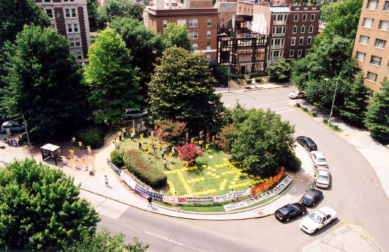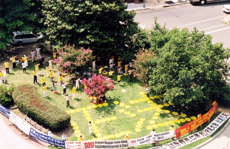 这时我看到旁边有个西方学员,没打横幅标语,坐在地上专心发正念,我也加入他的阵容。大约一小时后,我们睁开眼睛,发现第一排的欢迎团都把红旗扔在地上跑掉了,抬头一看,雨过天晴,往旁边一看,我们这一区的功友全部坐下来发正念。我们一句话也没有说,发完正念那些欢迎团的成员自动撤横幅标语。