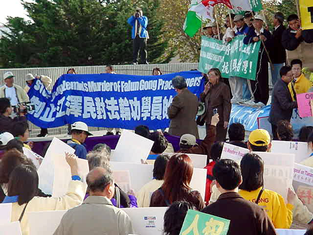 “江泽民”28日美国之行的最后一站是旧金山,旧金山市市长布朗准备了盛大午宴。在此同时,近千名抗议人士在旧金山中共领事馆外,进行大规模示威游行。北加州台湾人社团、法轮功、国际特赦组织、北加州西藏协会、中国民主阵线、大陆民运人士等十多个中外团体,占据了中共领事馆附近的主要人行干道,高举大型布条看板,为不同诉求,举牌抗议。