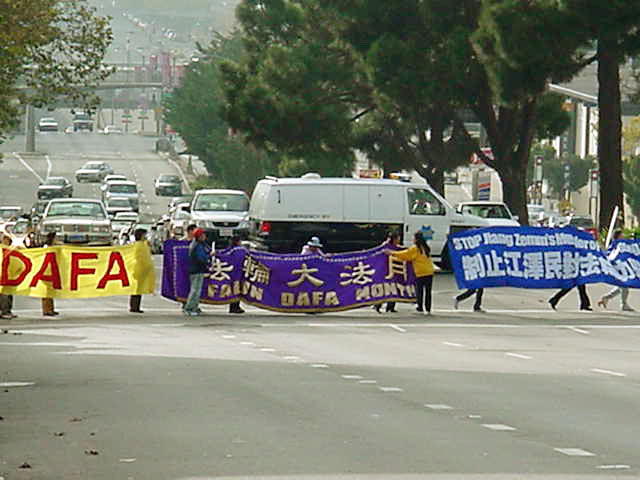 10月24日在机场接到同修后,我们马上来到洲际酒店发正念。我们到达的时候,被组织来欢迎江氏的欢迎团已经打着横幅,在610的路边大叫大嚷,不停地把法轮功学员挤开。我一手拿着法轮功的小旗,一手立掌专心地发正念。