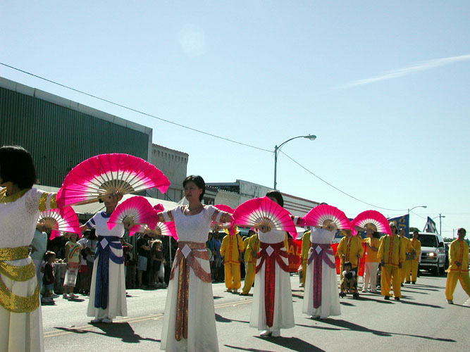 法轮功学员的游行队伍引人注目,金黄色的炼功服,印有“法轮大法好”的风车,还有队伍中精彩的舞蹈表演,博得了观众的阵阵掌声。观众们争先恐后地索要大法的材料,不时地有人说:“真美啊!”还有人说:“你们走过时,我们感到非常舒服,一片祥和。”