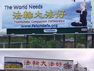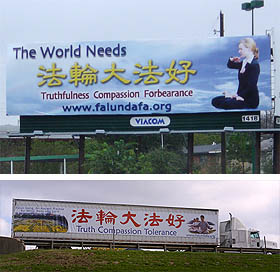 休士顿:在江XX访问期间,载有法轮功信息“法轮大法好,真、善、忍”的大型广告牌和卡车。所有法轮功的资料及活动均由法轮功学员自愿出资及参加