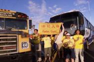 下午6点,当江的车队到达时,突然有三辆巴士开到并恰好停在法轮功的队伍前面,完全挡住了法轮功学员和他们的横幅。巴士冲过来力图堵住所有的路边空隙,但还是有一些学员手持小的横幅走出队伍让江的车队看到。