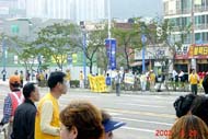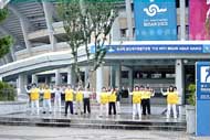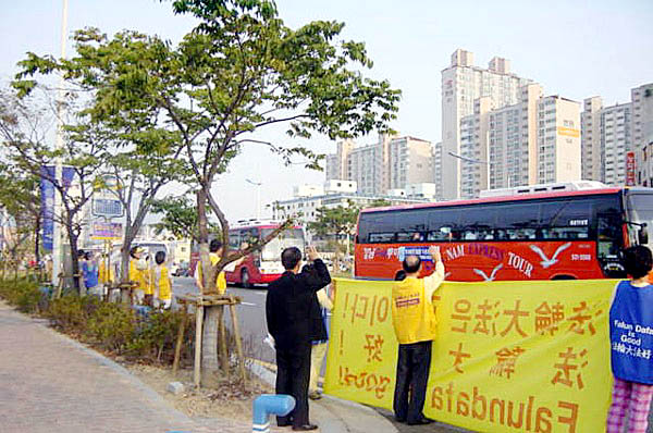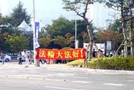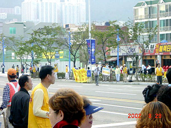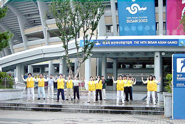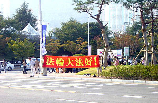 29日下午2点,来自汉城、大田、大邱等地的大法弟子与釜山同修一起,来到主赛场附近的各大主要路口,向来参加开幕式的14个国家的人们展开了大型洪法。一部分同修集体炼功,优美的炼功音乐配上缓慢柔和的炼功动作,引来大量行人驻足观看;一部分同修发放印有“法轮大法好”、“真、善、忍”字样的遮阳帽及扇子、真相传单等;还有一部分同修在各主要路口打起了“法轮大法好”、“真、善、忍”等横幅,各国运动员纷纷向我们招手致意。同修们在活动中始终持续发正念,这次洪法自始至终进行得很顺利。