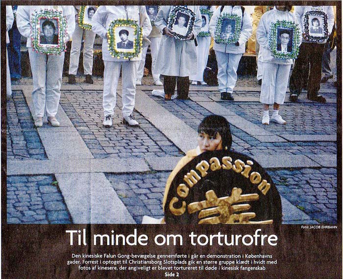 图一图一是第一版的大幅照片,大标题是“纪念的牺牲者。”图片说明:“昨天,中国法轮功精神运动成员穿过哥本哈根的街道进行和平示威。在走向克里斯丁堡城堡(首相府及议会所在地――译者注) 广场的队伍最前面的,是一群人数较多,身穿白色衣服,捧着那些在中国的监狱里被致死的中国人的照片的人。”