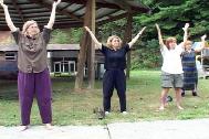 正午12时,我们在明亮的阳光下盘腿而坐,向环宇大穹发出纯正的正念,时间一分一秒的过去。当我蓦然回首,我看到我们身后的草地上也盘坐着六个人,以她们的方式感应着天地正气的回荡。当我们为她们讲解、演示、教授大法五套功法时,她们每一个人都是那么热切地聆听,那么虔敬、神往,那么迫不及待地学习功法动作,自始至终面带纯真的笑意,几乎是目不转睛地盯着教功学员的动作,直到五套功法教授完毕。她们高兴地接受了学员带来的珍贵的《转法轮》、教功录像带、真相光盘和资料,还有一面书写英文“法轮大法真善忍”的彩旗。