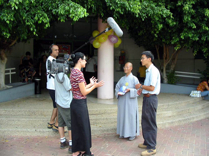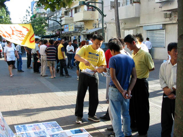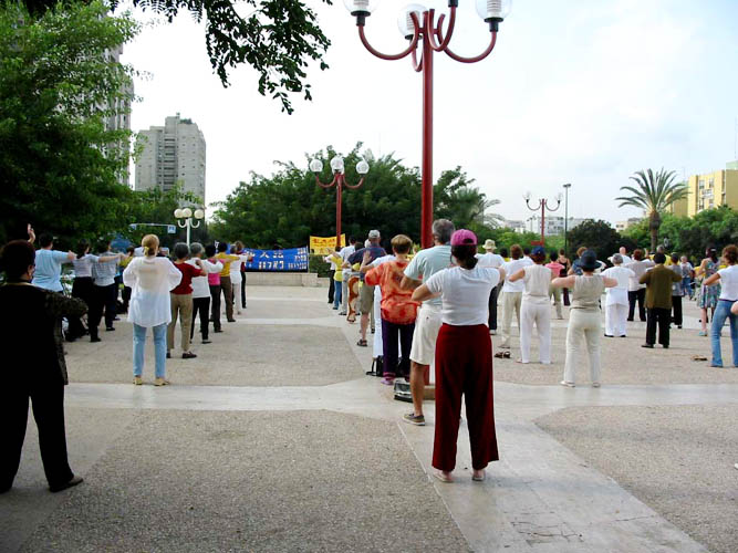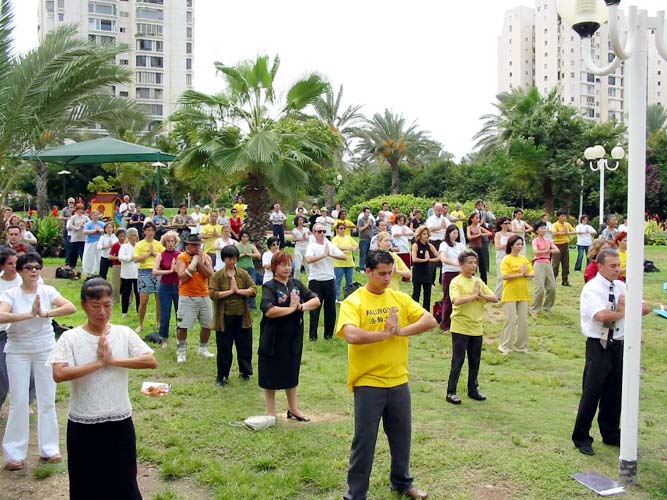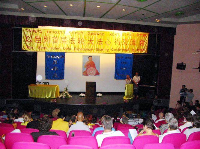 10月2日一早,法轮功学员和参加交流会的群众在特拉维夫北部的购物中心广场上伴随着音乐集体炼功。之后在装饰着“法轮大法-真善忍”的礼堂里用希伯来语、中文、俄语、英语,穿插着音乐节目进行心得交流。来自不同国家及背景的学员向到会的听众讲述他们以“真善忍”为准则修炼心性,使身心受益的心得体会,同时讲述了中国江氏集团迫害法轮功的实例。澳大利亚学员戴志珍和她两岁的女儿法度也参加了法会。她在发言中谈到江氏集团镇压法轮功之前,她的全家都因修炼法轮功而得到身体的健康和家庭的和睦。镇压后,她的丈夫陈承勇因在中国为法轮功和平上访而被关押、迫害致死。随后陈承勇的父亲也因迫害相继去世。陈承勇的姐姐未经过任何法律程序被关押在劳教所15个月,因精神上的折磨造成神智失常。曾经到过天安门广场请愿的西方学员讲述了在中国为法轮功和平呼吁的经历。