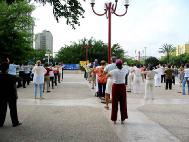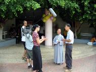 | 10月2日,在购物中心广场上炼功 | 记者采访学员 | |