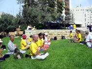 10月3日一早,学员们在耶路撒冷汽车总站对面的广场演示功法,向过路人介绍法轮功的“真善忍”法理及江氏集团对法轮功的残酷迫害。游行队伍到达另外一个街头公园集体炼功,发正念。到达耶路撒冷古城时,学员们分散在城内分发各种语言的大法真相传单,并在古城的Jaffa大门外的广场集体炼功,发正念。