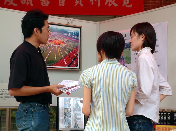 申请场地当天,我们排在所有社团倒数第4位。展览厅已有单位租借,而厅前面那块半圆形的舞台其实是人潮通过最多的地方。学校只好建议我们与已取得展览厅使用权的单位协调,借用那半圆形半露天式的舞台。如果说展览厅当时还没有别的单位先借用,我们就会要求在展览厅内展览,这样反而无法让更多人有机会看到大法的图片。有了这次的经历,我们要让大法在学校洪扬得更好,让更多的人能知道大法好!