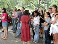 来来往往的学生很多,法轮功学员们的讲述吸引他们的目光,并深深地打动了在场的人。学员们还在路的两旁摆放了大法真相展板,许多人都驻足认真地阅读,表示对江XX政治流氓集团恶行的愤慨,想要帮助法轮功学员,有几百人在要求布什总统制止这场迫害的名信片上签了名,希望早日结束这场迫害。