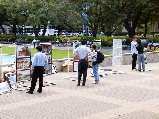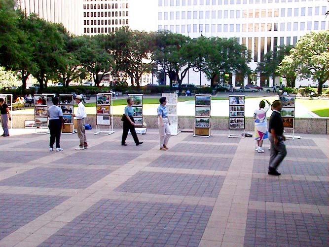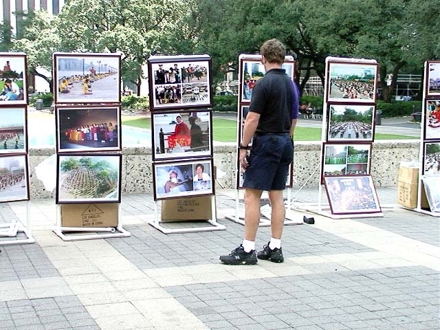 图片展吸引了不少市政府的工作人员,包括安全警卫人员,还有很多在其它大楼工作的人员。许多人看到了迫害的图片,都表示非常震惊,他们无法想象一个有益身心健康、祥和美好的功法竟然受到如此残酷的迫害,纷纷在给布什总统的明信片上签字,呼吁制止对法轮功的迫害。也有的人对功法非常感兴趣,寻问哪里可以学炼法轮功。