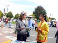 。其间我们遇到的一些中国同胞都很愿意与我们交谈,阅读真相展板和接受材料。一位刚从中国来的女士说,她在国内的大学工作,知道有炼法轮功的很多是高级知识分子,她对这场镇压很反感。一位学生模样的中国人指着一本真相材料说他以前收到过邮寄的。我们很高兴地看到越来越多的中国同胞们了解了真相,以前所做的各种努力在今天显现出了效果。