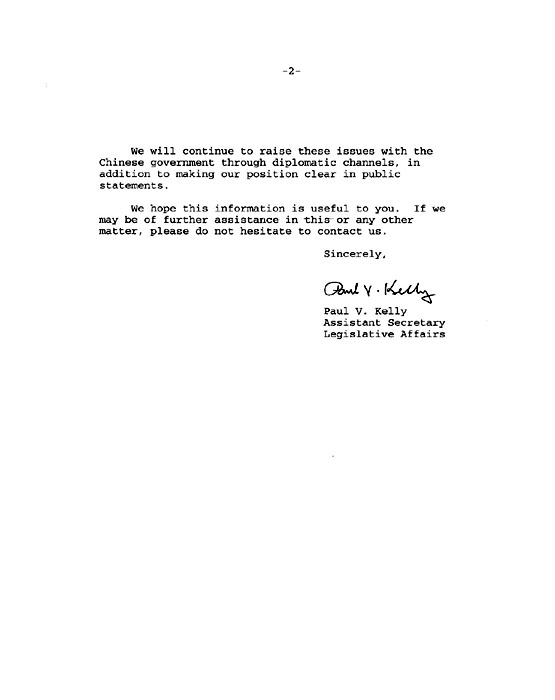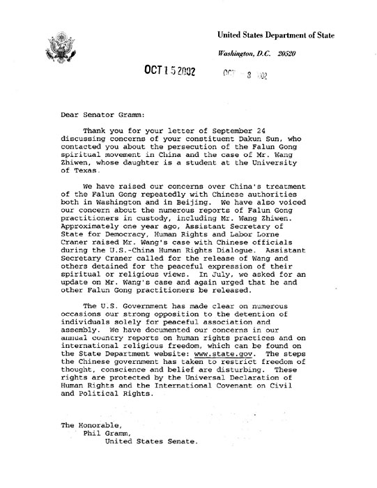 感谢您9月24日的信,信中详述了您的选民孙大坤关注的一些问题,他就法轮功精神运动在中国遭受迫害之事以及王治文先生的案件与您联系,王治文的女儿是德克萨斯大学的一名学生。