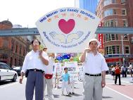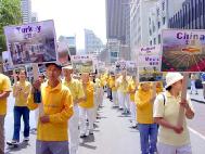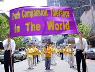 游行队伍浩浩荡荡蜿蜒一公里。队伍前后各有一辆警车开道和尾随,两侧各有一辆摩托警车相随,于大交通灯、交叉路口偶尔可见两个维持交通的警察。队列整齐,良好的秩序,阵容壮观,祥和、慈悲的强大场能,震撼着路边的市民、游客,双向车道的另一边,过往车辆司机及乘客们,有鸣笛支持的、有挥手致意的、有打着手势鼓劲的,人们都欣喜地观赏着法轮大法的盛大游行,并乐意接受或主动索取中英文大法资料,营救受迫害家庭成员传单,十多名大法弟子在路边派发资料,资料发得很快。两个中国大陆游客正在谈论,一个手指着游行队伍叫起来:“看,那么多旗帜,几乎每个国家都有法轮功!”另一人答道:“是啊,全世界到处都有法轮功啊。”“真、善、忍在中国”横幅队列旁,一位妇女脱口而出:“我要给政府写信,把法轮功遭受不公真相告诉他们。”两位刚下飞机的中国四川大陆人惊叹道:“啊,这么多人炼法轮功!在海外炼法轮功真自由,中国江氏政府专抓修真、善、忍的好人,太黑!”不少人对大法弟子挥着手,口中念着:“法轮大法好。”