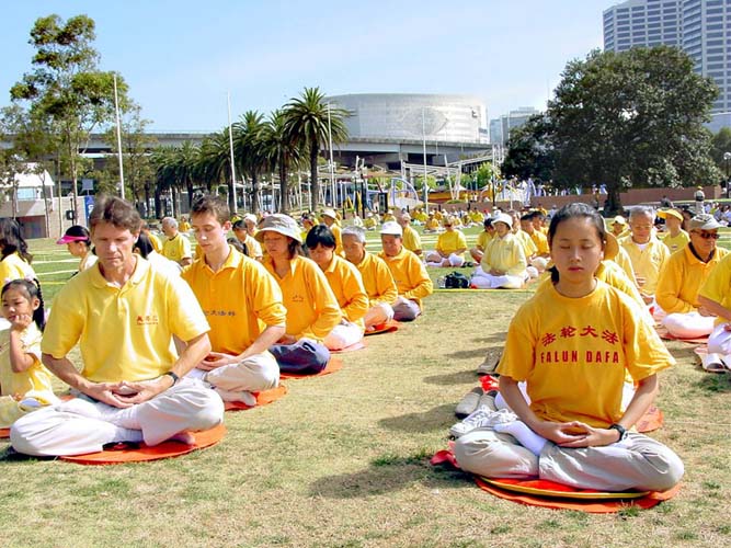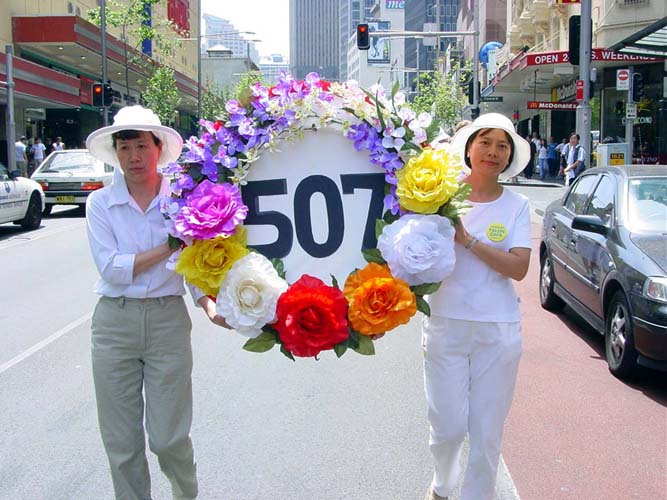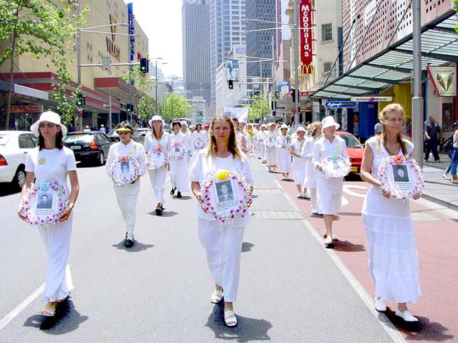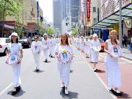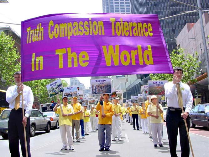 2002年11月9日中午12点多钟,千余名大法弟子在悉尼市中心举行了“世界需要真、善、忍”大游行。游行队伍从市政厅广场出发,沿乔治(George)街向南缓缓行进。游行队由五大部分组成,其中包括蓝底黄字大型英文横幅“世界需要真、善、忍”,26名分别身着唐装和仙女装服饰的大法弟子。大法弟子40人举着40张国家图片板;20人举着20种不同语种的“真、善、忍”标幅;在身着黄色、白色上衣的队列前面,在“真、善、忍在澳洲”英文横幅后,40人举着40个城市名牌板。