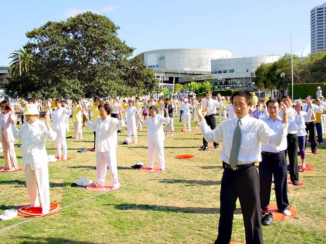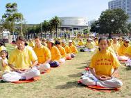 11月9日上午8:30时至9:45时,五百余名大法弟子在悉尼达令港图白龙公园(TUMBALONG PARK)进行大型组字、洪法炼功活动。清晨5:00时,大法弟子便赶往现场进行准备。青青的草地上,铺着由金黄色线条构成的,超过公园一半面积以上的巨大地球图形,图形上端铺着大型蓝底黄字英文横幅,“法轮大法”,横幅下方,由身穿黄色上衣的大法弟子组成英文“遍及世界”字型。随着祥和、优美的炼功音乐声,大法弟子展示了1-5套功法。在蓝天白云映衬下,金灿灿的“法轮大法遍及世界”图形壮观殊胜。