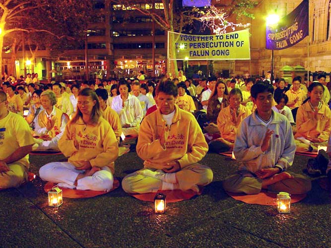 11月9日大游行当晚6点半至9点钟,400余名大法弟子在悉尼市政厅广场举行烛光悼念活动,悼念中国大陆被江氏集团迫害致死的500多名大法弟子,每半小时发正念,有效地清除着另外空间邪恶的物质因素。