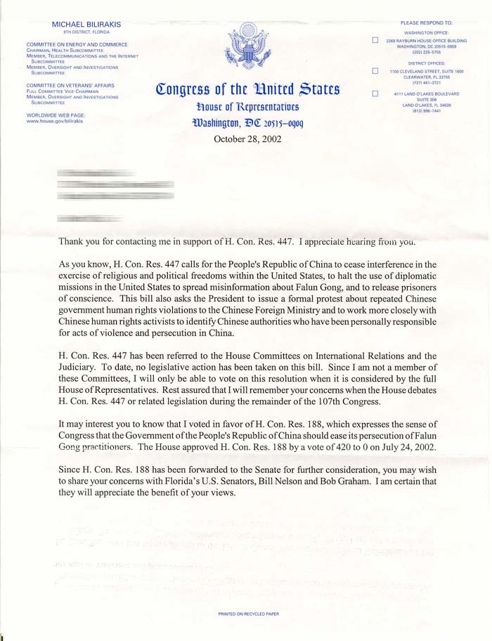 您也许有兴趣知道,我投票支持了国会188号决议,该决议表达了国会认为中国[江氏政府]应停止迫害法轮功学员的观点。国会于2002年7月24日以420票对0票通过了该决议。