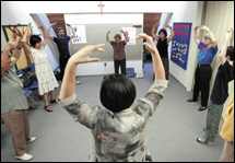 薛说:“这位女士70多岁了,你看得出来吗?她今年72岁。”她指向一位法轮功学员吴太太,看上去起码比她的实际年龄年轻10岁。