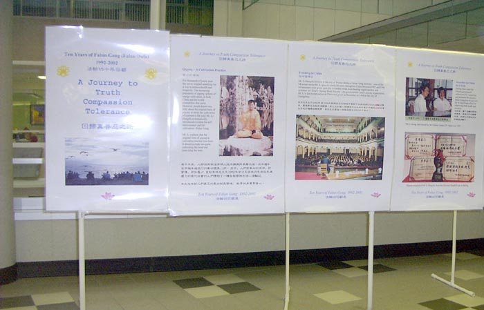 在堪萨斯城学员的帮助下,我们在学校的学生活动中心举办了为期四天的“回归真善忍之路”图片展,并播放了揭露迫害真相的录像,派发了大量大法简介和真相资料。期间很多过往的学生和学校的工作人员表示对江氏集团残酷镇压的极度不解,前来询问如何帮助制止迫害,并有一些人提出要参加炼功。其中一个美国女孩来到我们的展位前问道:“我怎么参加你们的活动?”我问:“你是想帮忙还是想学功?”她毫不犹豫地答道:“都想。”她坦率的语言和纯真的目光令人十分感动。