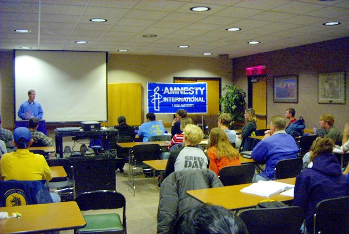 在图片展的基础上,大赦国际帮助我们成功举办了一场揭露江氏集团迫害法轮功的专题讲座。几名学员也驱车赶来支援。讲座首先由一名历史系专攻中国历史的老师介绍了中国及XX党的政策和历史,中国的人权状况等背景资料,然后讲述了她对这场镇压的起因的理解。之后放映了功法的简单演示和13分钟的录像片“SOS!紧急救援中国被迫害的法轮功学员”。一个个真实而又悲壮的场面打动了在场的观众。接下来由身为该校在校学生的学员讲述了自己在国内两次被关押的亲身经历,使观众们感受到了这场迫害其实离他们并不遥远。然后由一名曾因去天安门请愿而被抓被驱逐的美国学员介绍了他为什么要去和他在中国的经历,进一步引起了观众们对迫害的深切关注。最后四名学员演示了五套功法,展示了大法的美好及祥和。原来预计一个小时的讲座持续了近90分钟,三、四十名观众在给市政府、州参、众两院议员的联名信上签字之后仍迟迟不愿离去,继续留下和学员们交谈。