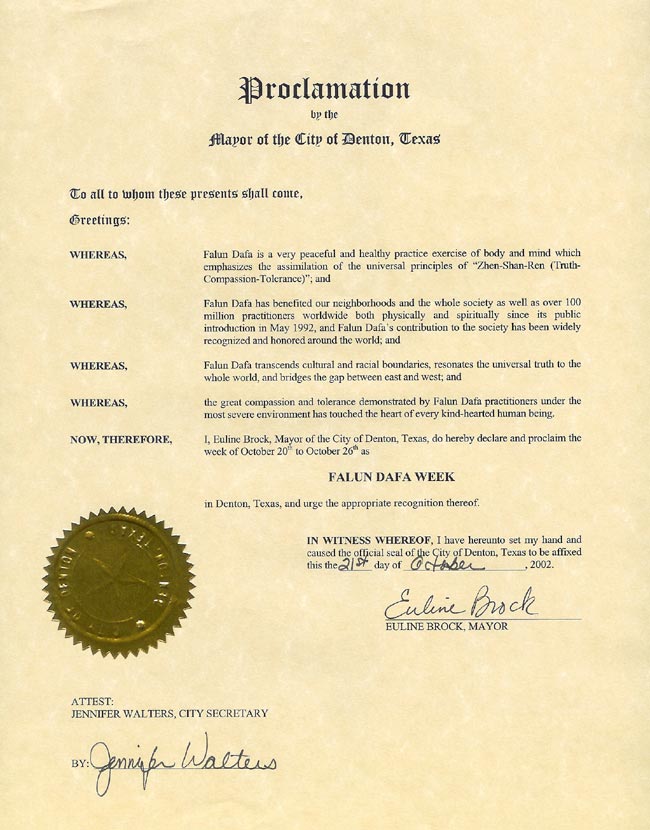 鉴于,自1992年5月传播于世以来,法轮大法使我们的社区,整个的社会,乃至全世界上亿的学员身心受益,法轮大法对社会作出的贡献在全世界被广泛认同及表彰;并且