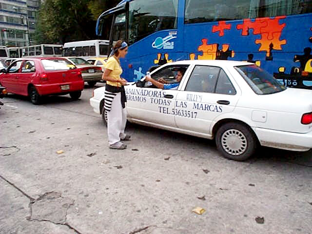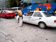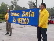2002年10月10日在墨西哥城最大的广场上两名当地学员展示横幅"法轮大法在墨西哥"