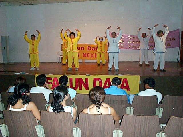 2002年10月9日,墨西哥城国家图书馆(National Library)前,法轮功学员展示功法