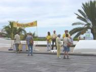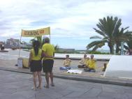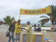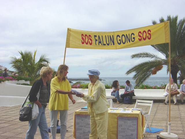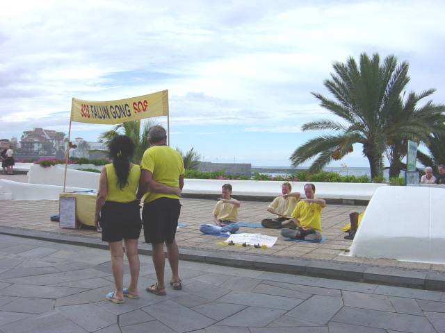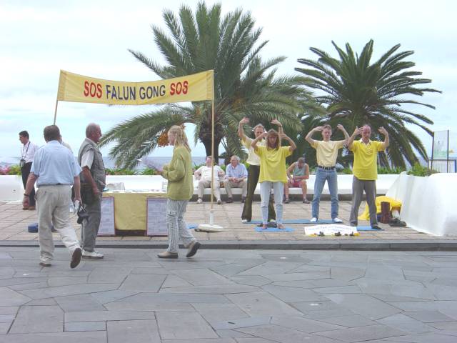 三、四个学员演示功法,其他的学员有的发传单,有的与来往的游客交谈。我们用的是短的音乐带,即五套功法一共三十分钟,接着五分钟发正念。这样观众们更有兴趣来欣赏。