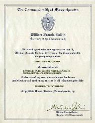 我,麻州州务卿威廉-弗朗西斯-阁尔文,特此非常荣幸地祝贺: