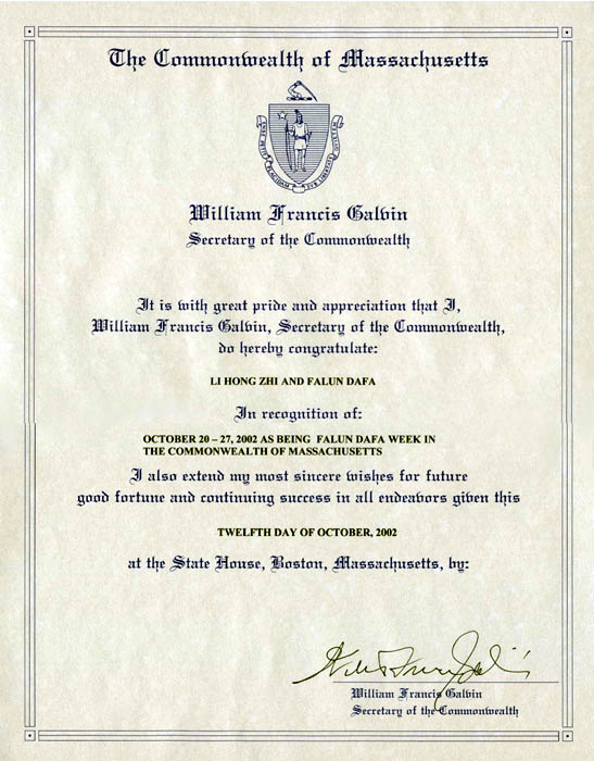 确认2002年10月20日至27日为麻萨诸塞州“法轮大法周”