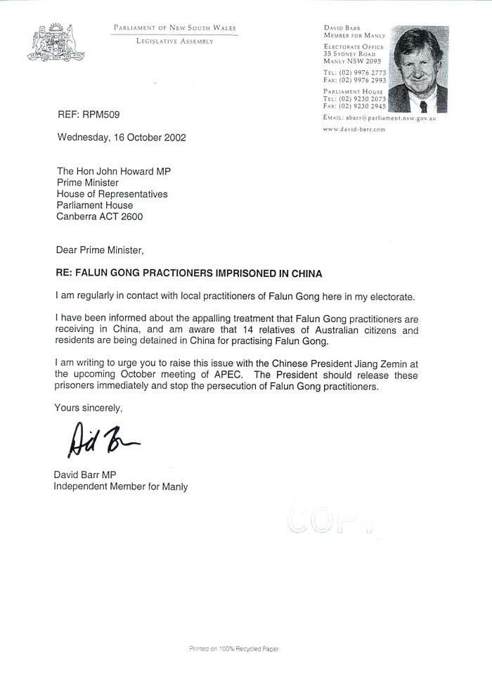 我获悉法轮功学员们在中国正在遭受着骇人听闻的虐待,并且知道澳大利亚公民与居民的共14位亲属由于修炼法轮功在中国被拘留。
