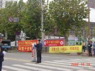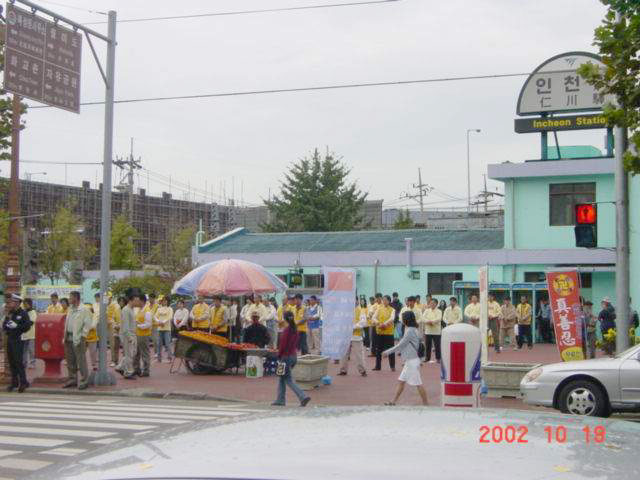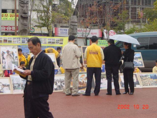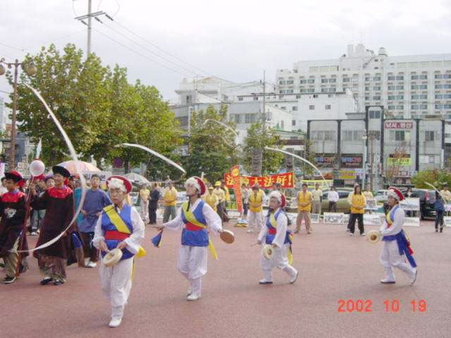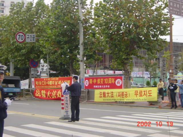 当来到华侨联欢的主会场时,发现不少中共便衣特务四处乱窜。我们没有理会这些,开始边发正念边发放印有“法轮大法好”等字样的彩色气球。不多时,山上山下和主会场内外到处飘动着“法轮大法好”字样的彩色气球。这时, 一直监视我们活动的便衣们开始干扰我们,让我们离开此处,其中一个人踩破了几个气球。同修发现后立刻上前严词阻止,并且让他道歉,在同修们强大的正念面前,他只好乖乖地向我们致歉。当便衣“头目”过来赶我时,我指着气球上的字让他看,并郑重的高声读着:“法轮大法好!”他笑着朝我点了点头。我用韩语和汉语连续高声读了几遍“法轮大法好”之后,有五~六个便衣眼露凶光奔过来,这时,我赶紧拿出随身携带的真相光碟,举在手里高喊着:“天安门自焚真相”、“天安门自焚真相”……一群华侨纷纷围拢过来索取光盘,中共特务们被挤在外面干着急没办法。在此同时,同修们也纷纷拿出各种真相资料发放起来,有的同修开始集体炼功,有的同修挂起了大法的横幅,摆上了真相展板。就这样,我们不为干扰所动,全身心的做着我们该做的,那几个特务也不知什么时候溜走了。