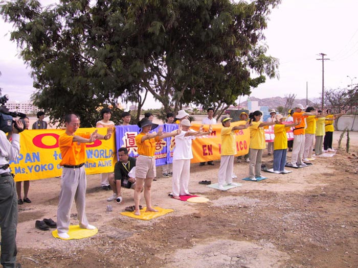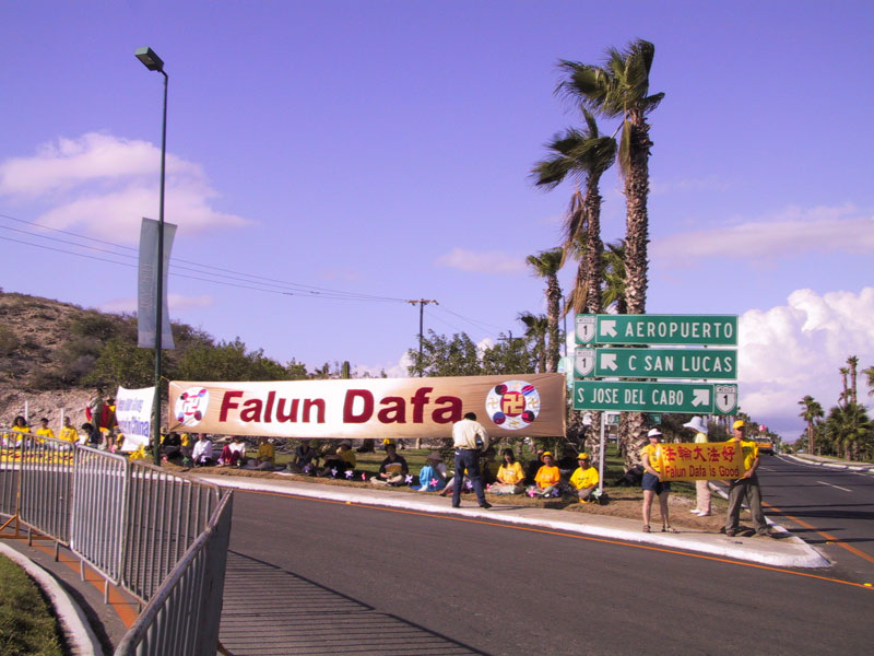 【明慧网2002年11月8日】十月二十二至二十八日,法轮功学员在江到访墨西哥洛斯卡沃斯(Los Cabos)参加APEC会议期间举行抗议活动。