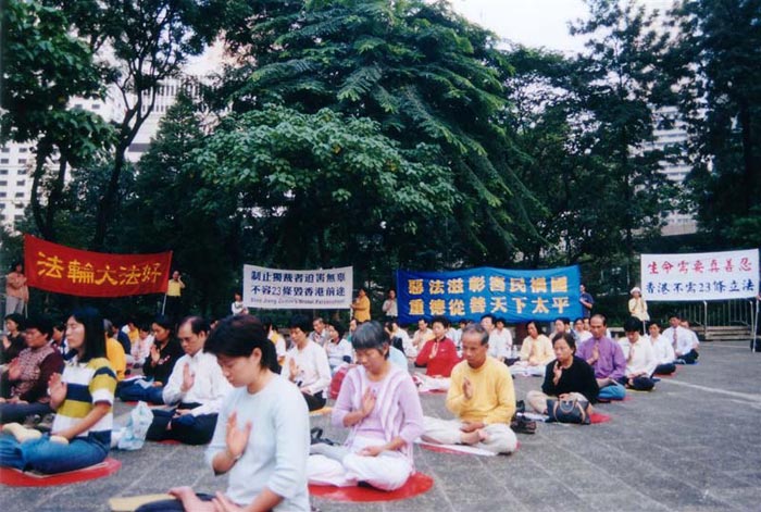 【明慧网2002年11月9日】香港立法会11月7日进行有关基本法第23条立法的第一场公听会期间,下午四时到七时,百多名香港学员在其外的遮打花园静坐,抗议23条立法将江XX集团的暴政延伸到香港,并密集发正念清除另外空间操纵人的邪恶因素。