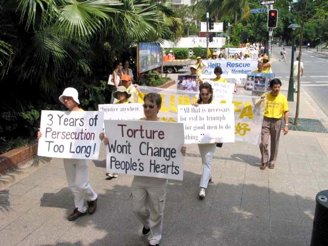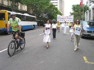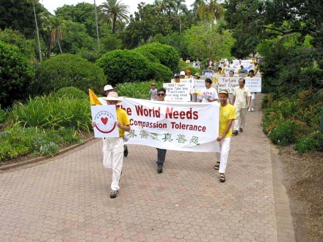 11点30分,学员在山科(Suncorp)公园整队游行。鉴于我们在以往很多活动中建立的良好声誉,布里斯本市警察对我们非常信任,我们的游行申请半小时之内就得到批准。这次游行,前一半是横穿市中心的街心游行,后一半是穿过植物园沿人行道通过商业中心。这种结合使更多的人看到了我们的游行队伍。